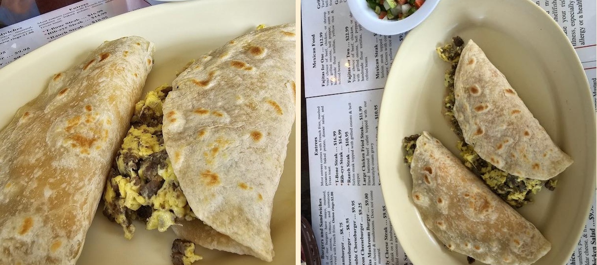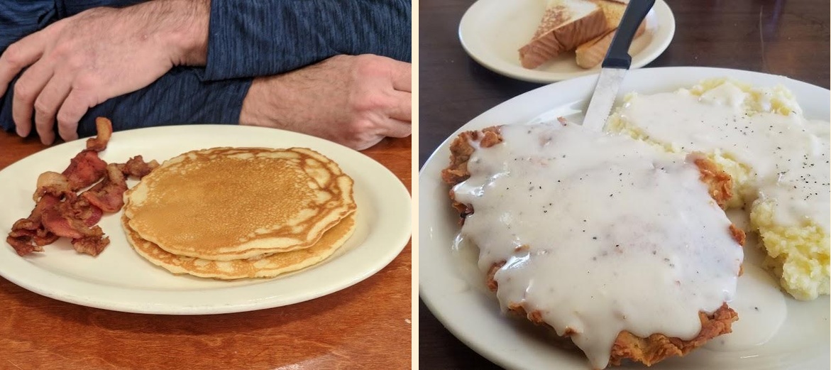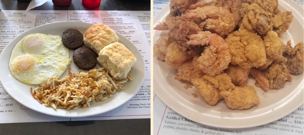 Try the Cheese Omelet for breakfast, the Chicken Fried Steak for lunch, and the Garlic Butter Shrimp for dinner. Their desserts are also worth it!